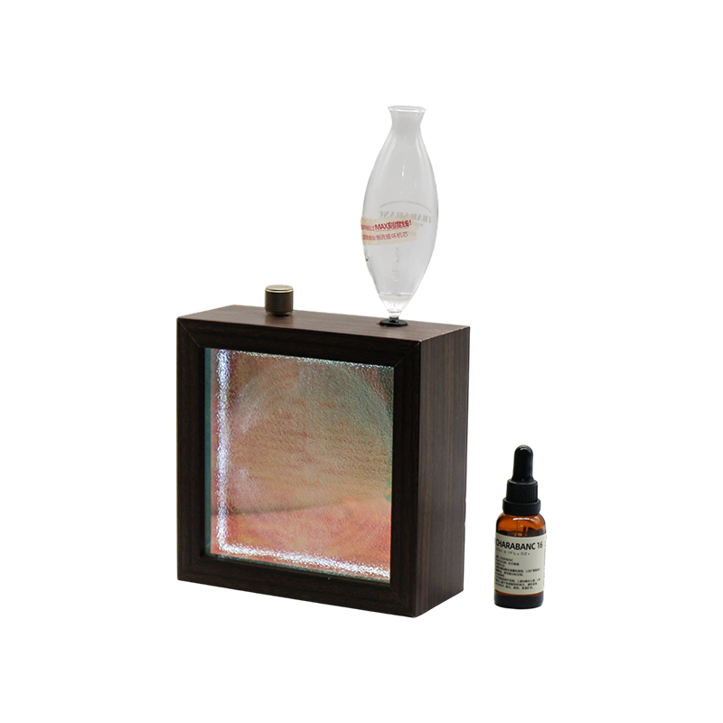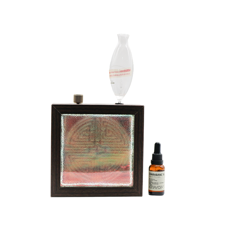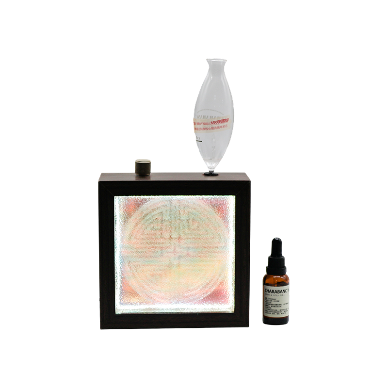 ダーク無垢木ベースに構築された半透明のクリスタルパネルが内部にグラデーションの輝きを生み出し、京都の夕暮れを彷彿とさせる。天板には精油ボトルを置け、温かな光と共に香りがゆっくりと拡散する様は、枯山水庭園の「余白」を想起させ、現代生活に侘び寂びの美学を吹き込む。寺院のステンドグラスに着想を得た中央の曼荼羅模様は、オレンジ、イエロー、ピンクグリーンが織りなすエネルギーフィールドを形成し、瞑想的な状態へと誘う。